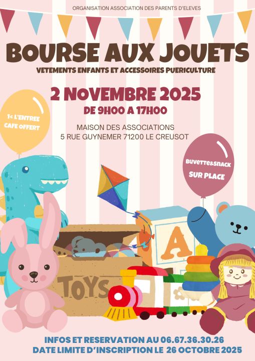 L'Association de parents d'élèves organise une bourse aux jouets le dimanche 2 novembre. Vous trouverez ci-joint le flyer d'information.
